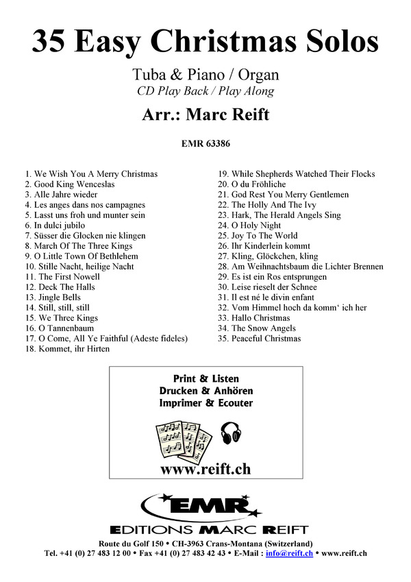 1. We Wish You A Merry Christmas 2. Good King Wenceslas 3. Alle Jahre wieder 4. Les anges dans nos campagnes 5. Lasst uns froh und munter sein 6. In dulci jubilo 7. Süsser die Glocken nie klingen 8. March Of The Three Kings 9. O Little Town Of Bethlehem 10. Stille Nacht, heilige Nacht 11. The First Nowell 12. Deck The Halls 13. Jingle Bells 14. Still, still, still 15. We Three Kings 16. O Tannenbaum 17. O Come, All Ye Faithful (Adeste fideles) 18. Kommet, ihr Hirten 19. While Shepherds Watched Their Flocks 20. O du Fröhliche 21. God Rest You Merry Gentlemen 22. The Holly And The Ivy 23. Hark, The Herald Angels Sing 24. O Holy Night 25. Joy To The World 26. Ihr Kinderlein kommt 27. Kling, Glöckchen, kling 28. Am Weihnachtsbaum die Lichter Brennen 29. Es ist ein Ros entsprungen 30. Leise rieselt der Schnee 31. Il est né le divin enfant 32. Vom Himmel hoch da komm' ich her 33. Hallo Christmas 34. The Snow Angels 35. Peaceful Christmas