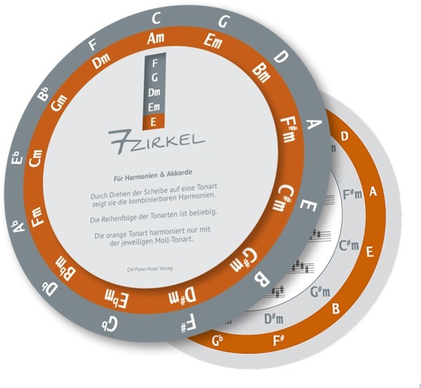 Hier geht's zum Erklärfilm Was haben Beethoven und AC/DC gemeinsam?Oder Adele und Mozart?Sie alle komponieren ihre Musik nach dem selben Prinzip.Passende Harmonien und Akkorde!Jedes Musikstück besteht aus Akkordfolgen, ausgehend von der jeweiligenGrundtonart.Hier kommt der 7-Zirkel in's Spiel.Durch den 7-Zirkel kannst du ganz leicht durch simples Drehen der Scheibeablesen, welche Akkorde zur jeweiligen Grundtonart harmonieren. Es stehenimmer die 7 verschiedenen und passenden Tonarten übereinander. Jetzt kannstdu danach ganz einfach improvisieren und eigene Musik komponieren. Dieorangen Tonarten harmonieren nur mit der jeweiligen Molltonart, z. B. Am mitE. Wenn ein Musikstück z. B. in C-Dur (Grundtonart) geschrieben ist, dannklingen Akkorde einfach gut und harmonisch, die zu C-Dur passen. Die 7 Tonarten können absolut frei miteinander kombiniert werden und passenimmer harmonisch zusammen.Die Vorzeichen der jeweiligen Tonart stehen im Quintenzirkel auf derRückseite des 7-Zirkel. Für wen ist der 7-Zirkel geeignet?Für alle die ...ein Instrument spielen oder erlernen wollenSongs schreiben möchten oder für sich selbst improvisieren den Quintenzirkel erlernen wollen (in der Schule, Musikschule, Musikstudium)