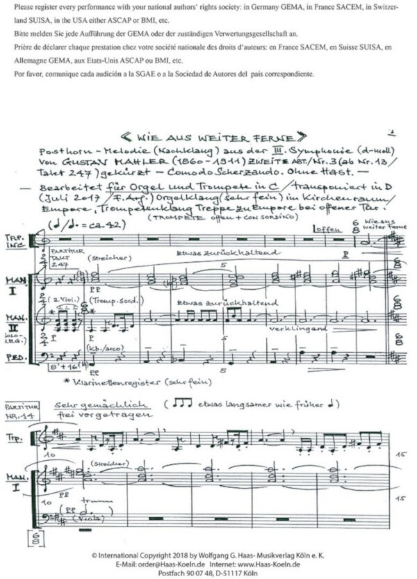 Die vorliegende Bearbeitung "Wie aus weiter Ferne" ist im Gedenken an den großen Meister der Tonkunst, Gustav Mahler (1860-1911) entstanden. Diese Arbeit soll in keiner Weise nur eine Transkription aus der Orchester-Partitur sein, sondern - im erweiterten Sinne - auch einen in der LITURGIE der ökumenischen Gemeinden und bei Gedenkfeiern geeigneten musikalischen Beitrag ermöglichen. Die Verbindung und der Wechsel der "Diesseits und Jenseits" melodischen schlichten Tonfolge des entfernten Klangs der C Trompete und des Orgelregisters der Klarinette, sollen im Zusammenklang mit den gesamten feinen Orgelregistern im Kirchenraum einen erhabenen und beseelten Audruck auf die Zuhörer bewirken.