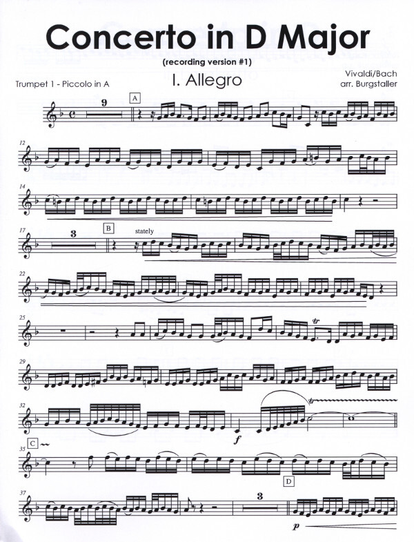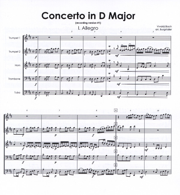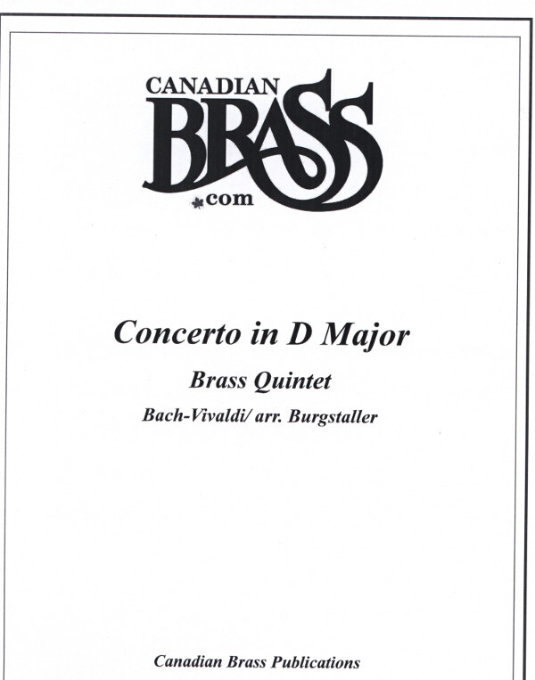 Bach composed several Concerto's inspired by themes of Anotonio Vivaldi. This particular concerto adapted for brass quintet was recorded on the Canadian Brass CD, BACH. It is written for 2 Bb trumpets (Trumpet 2 part has optional pic in A part), Horn, Trombone and Tuba and includes a score.