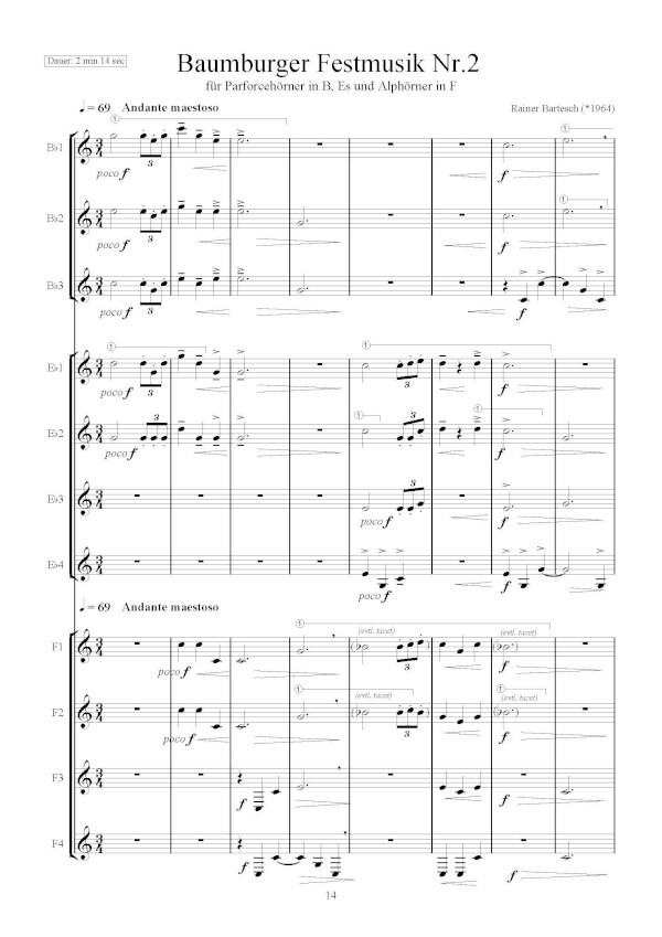 für 3 Naturhörner in B, 4 Naturhörner (Parforcehörner, Alphörner, in Es) + 4 Naturhörner (Alphörner, in F)