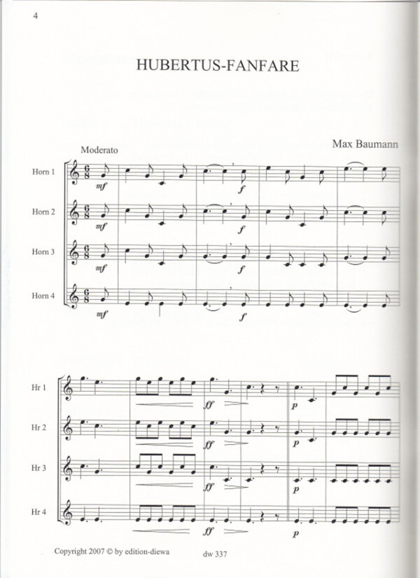 Naturplesshörner in B (Horn 1-3), 4. Stimme Parforcehörner in B (beiliegende Stimme), dazu kann Horn 1-3 mit Parforcehörnern in B besetzt werden Parforcehörner in Es spielen Stimme 1-4 aus der Partitur 1. + 2. Stimme Plesshorn + 3.+ 4. Stimme Parforcehorn in B Spielpartitur