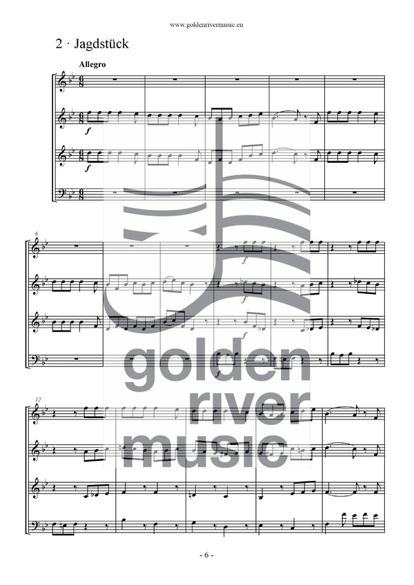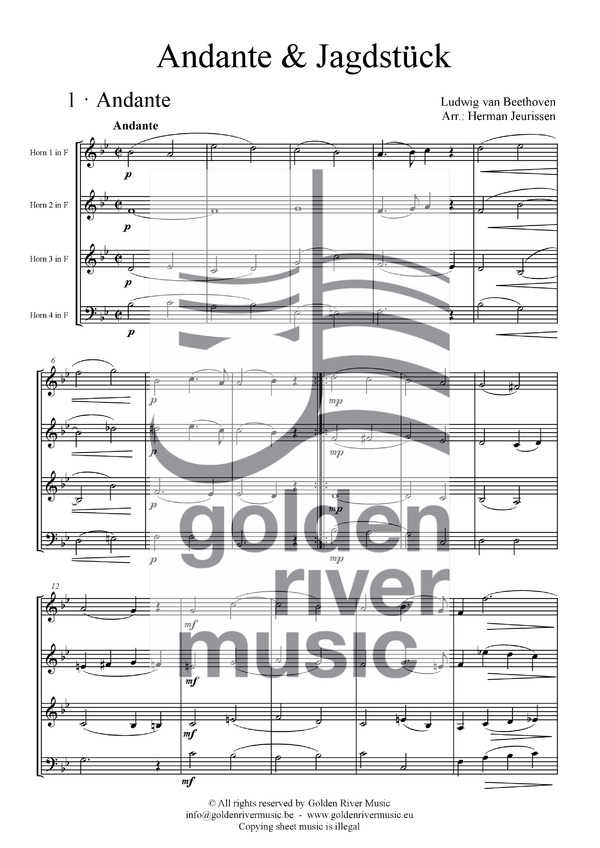 Andante & Jagdstück are based on several sketches by Ludwig van Beethoven, which are housed in the British Library in London. The first movement is an elaborate quartet fragment in E-flat major. Likely intended as the beginning of the second movement of a string quartet, it is, with just a few small adaptations, very playable with four horns. Several uninstrumented sketches in 6/8 time are found in the so-called Kafka-Sketchbook. Since the main theme strongly resembles a traditional 18th-century hunting fanfare, the fragments are elaborated into a genuine Jagdstück (Hunting piece). Both fragmentary compositions were written by Beethoven around 1795/6 and blend remarkably well together. The result is undoubtedly a patchwork, but almost 90% of these two short compositions is based on (completely unknown) original music by one of the greatest composers in music history.