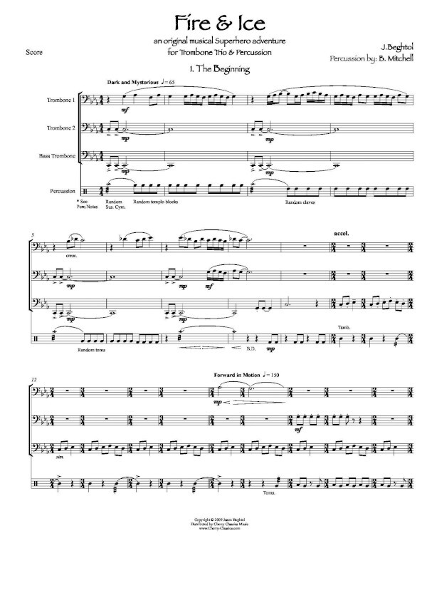 ("An original musical Superhero adventure", 2 Sätze, mit einer "Geschichte") 3 Posaunen + Percussion (1 Spieler, Instrumentarium: Tom toms, Bass Drum, Claves, Shekere, Suspended Cymbal, Temple Blocks, Tambourine, Congas, Hammer & Anvil, Snare Drum)
