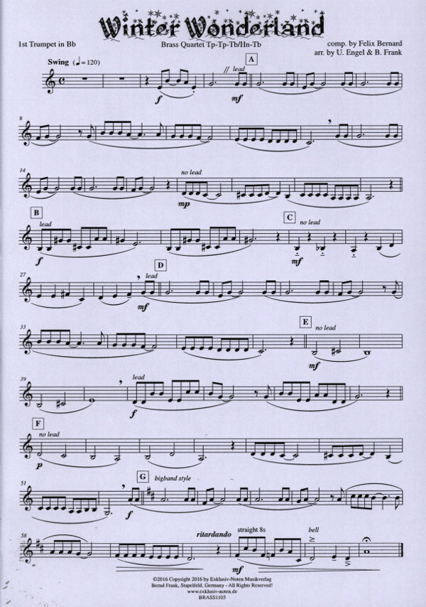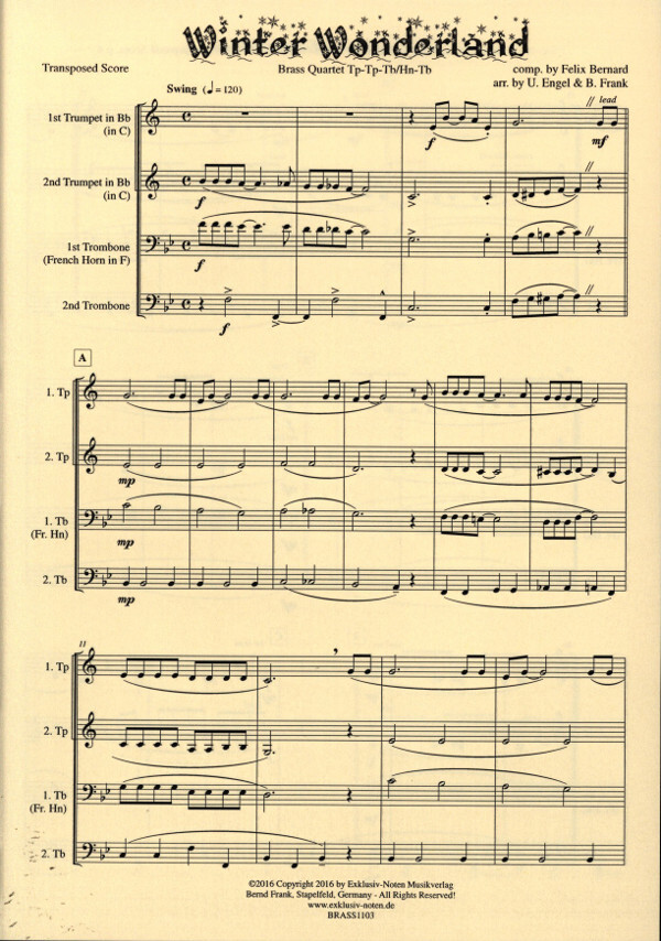 Inhalt: Partitur 1. Stimme für Trompete in B und C 2. Stimme für Trompete in B und C 3. Stimme für Posaune in C und Horn in F 4. Stimme für Posaune in C