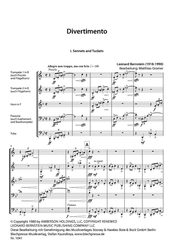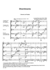 Bernstein schrieb das Divertimento anläasslich des 100. Jubiläums des Boston Symphony Orchestra. Die acht Sätze sind unterschiedlich, gewitzt und haben z.T. Ohrwurmqualitäten. Das Stück ist schwierig in allen fünf Stimmen.