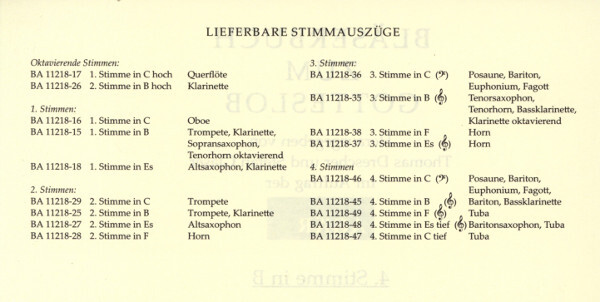 Die Ausgabe enthält 175 Vorspiele plus zugehörige Sätze zur Gemeindebe- gleitung. Neben einer Partitur jeweils in C- und in B-Stimmung bietet sie eine außergewöhnliche Vielfalt an Einzelstimmen. Angeboten werden sämtliche einschlägigen Blechblasinstrumente sowie verschiedene Stimmungen für Klarinette und Saxophon. Den verschiedenen Besetzungen von Bläserensembles wird dadurch in besonderer Weise Rechnung getragen.