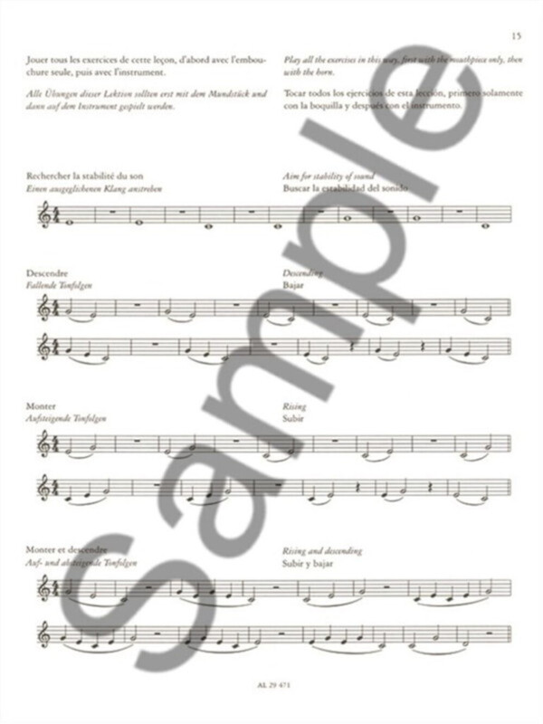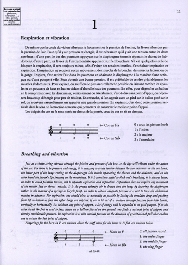 Text in deutsch, französisch, englisch und italienisch mit: Atmung und Schwingung Stakkato Artikulation Achtelnote mit Grifftabellen in F und B