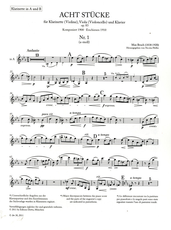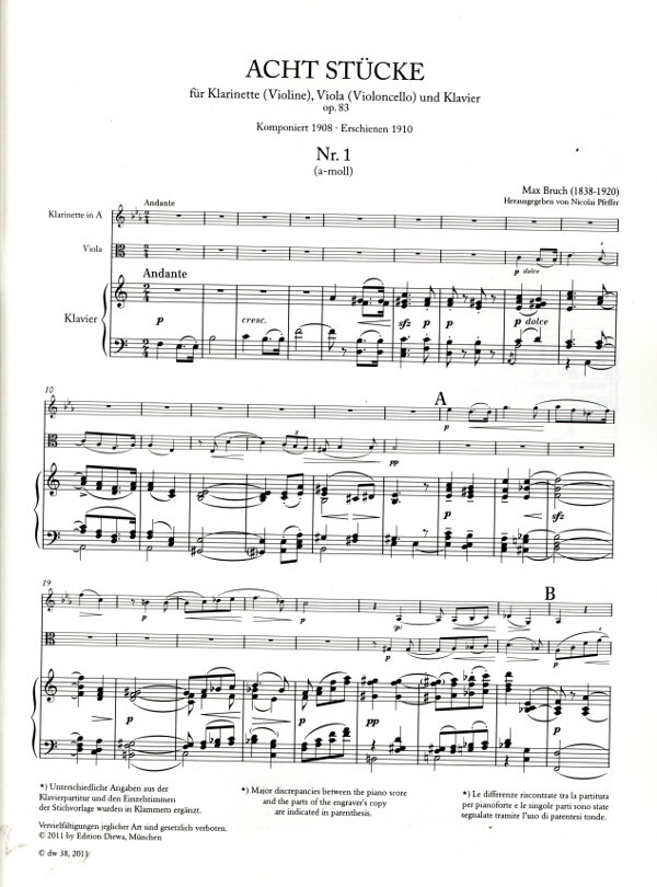 enthält zusätzlich eine Partiur aller Solostimmen zum direkten Vergleich für Klarinette in B/A (Violine), Viola (oder Violoncello) und Klavier