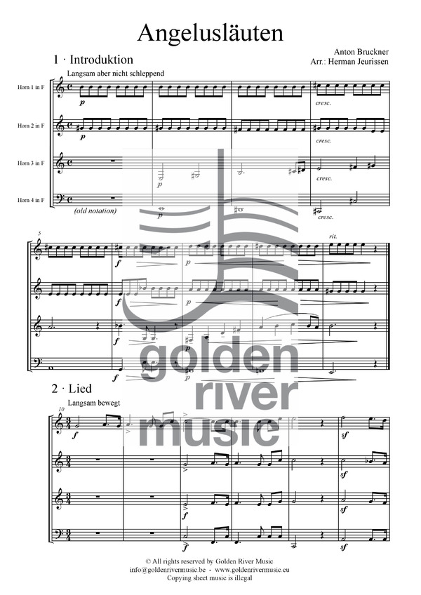 Anton Bruckner composed the Festkantate Preiset den Herrn, lobsingt seinem heiligen Namen in 1862. The choral part from this work was arranged at the beginning of the 20th century by the Viennese horn player Karl Stiegler under the name Angelusläuten. The preceding song for a quartet of male voices and its introduction also lend themselves perfectly to an arrangement for horn ensemble. The introduction in particular foreshadows the long melodic lines in his symphonies. The arrangement also offers a fairly simple but well-sounding first introduction to Bruckner's oeuvre.