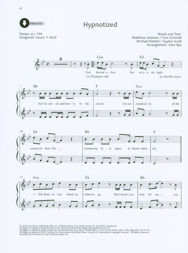 Die schönsten Popsongs, bekannte Filmmelodien und zeitlose Evergreens: Band 4 der Reihe Pop For Trumpet enthält 12 leicht gesetzte Arrangements für 1-2 Spieler mit passenden Playbacks zu jedem Song. Aktuelle Chart-Hits wie Easy On Me oder Blinding Lights stehen neben den Pop-Klassikern Time After Time und Clocks. Echte Highlights für Trompete sind Feels So Good, Boogie Down und eine neue Bearbeitung des Abba-Klassikers Waterloo.