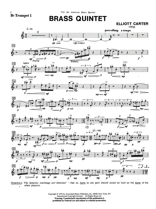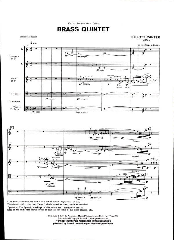 The Brass Quintet was written during the summer of 1974 for the American Brass Quintet which commissioned the work. This group gave its premiere on October 20, 1974 at a Charles Ives Festival broadcast by the BBC from London, and its American premiere at the Library of Congress on November 15, 1974, and has recorded the work for Columbia Records.