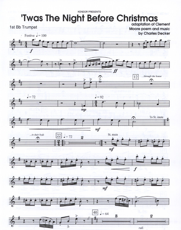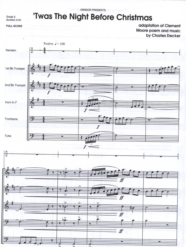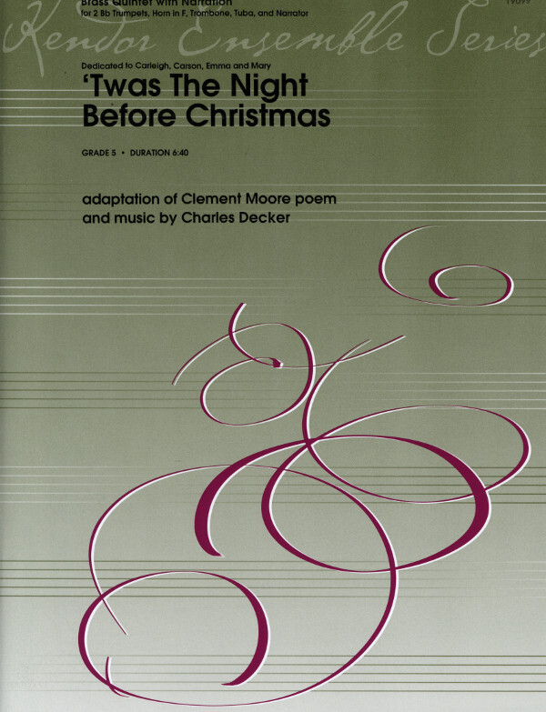 This clever setting for brass quintet with narrator of Clement Moore's classic Christmas poem entertains and amuses young and old with imaginative scoring and special brass effects to tell the endearing story of Santas annual visit. Duration 6:40