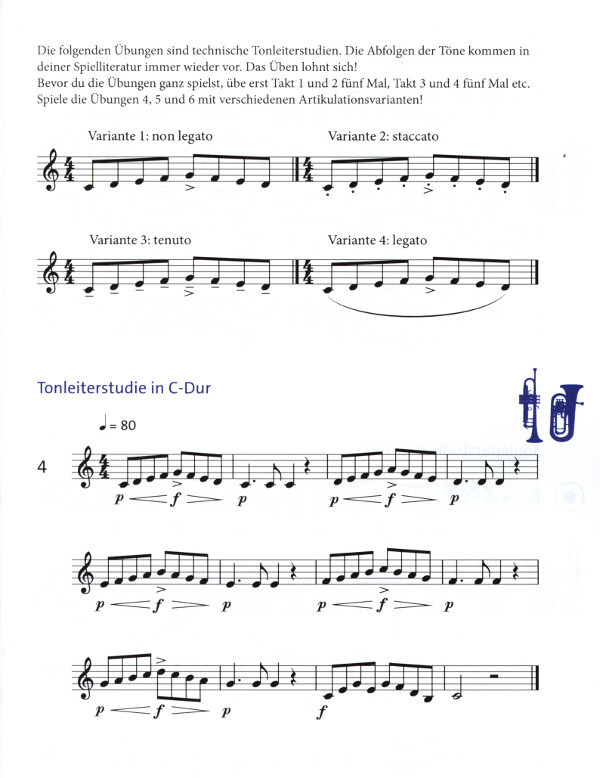 In vier Kapiteln erweitert der zweite Band der Instrumentalschule Fähigkeiten und Fertigkeiten des Trompetenpiels. Mit der Erarbeitung neuer Tonräume in C-, F-, Es-, As-Dur können neue Stücke und Etüden bewältigt werden, teilweise im Duett oder sogar im Trio. Die Schule besticht durch durchweg praxisorientiertes Arbeiten mit dem Instrument. Neben speziellen Übe- und Gestaltungsmöglichkeiten für Tonleitern wird auch der Dynamik, der Phrasierung, der Atmung und dem Rhythmusgefühl ein großer Raum beigemessen. Musiktheoretische Parameter werden in gewohnter Weise zu Beginn jedes Kapitels behandelt. Spielerisch eingebundene Denkaufgaben fordern den Schüler auf, die Stücke nicht nur abzuspielen, sondern sich bewusst mit ihrem Aufbau und dem Notentext auseinanderzusetzen. Am Ende vieler Kapitel kann der Schüler im Quiz seinen jeweiligen Lernstand überprüfen. Mithilfe der beigelegten CD können Übungstücke und Lieder noch einmal angehört oder im Zusammenspiel geübt werden.