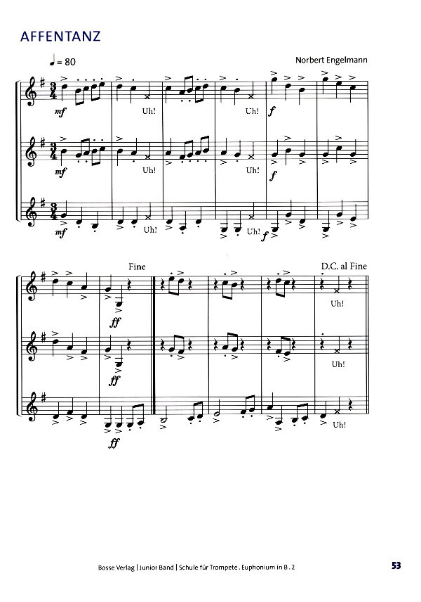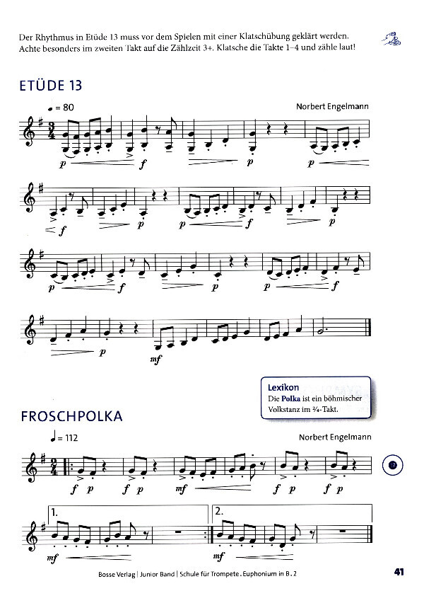 In vier Kapiteln erweitert der zweite Band der Instrumentalschule Fähigkeiten und Fertigkeiten des Trompetenpiels. Mit der Erarbeitung neuer Tonräume in C-, F-, Es-, As-Dur können neue Stücke und Etüden bewältigt werden, teilweise im Duett oder sogar im Trio. Die Schule besticht durch durchweg praxisorientiertes Arbeiten mit dem Instrument. Neben speziellen Übe- und Gestaltungsmöglichkeiten für Tonleitern wird auch der Dynamik, der Phrasierung, der Atmung und dem Rhythmusgefühl ein großer Raum beigemessen. Musiktheoretische Parameter werden in gewohnter Weise zu Beginn jedes Kapitels behandelt. Spielerisch eingebundene Denkaufgaben fordern den Schüler auf, die Stücke nicht nur abzuspielen, sondern sich bewusst mit ihrem Aufbau und dem Notentext auseinanderzusetzen. Am Ende vieler Kapitel kann der Schüler im Quiz seinen jeweiligen Lernstand überprüfen. Mithilfe der beigelegten CD können Übungstücke und Lieder noch einmal angehört oder im Zusammenspiel geübt werden.