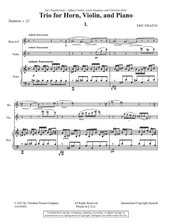 Intimately familiar with the Brahms Trio for the same forces, Ewazen uses that masterpiece as a starting point for his own four movement creation. The Trio was commissioned by Chamberosity, who premiered and recorded the work. For advanced performers.