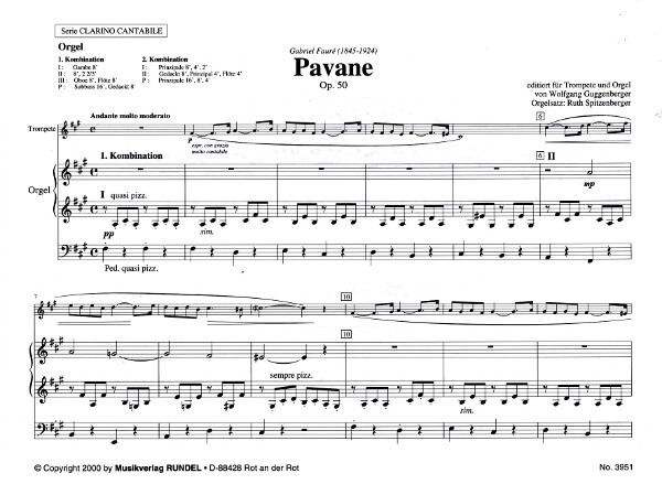 Seine Pavane (op. 50) schrieb Gabriel Fauré im Jahre 1887 für Orchester mit Chor ad libitum. Der den Chorstimmen unterlegte Text handelt vom Leiden in der Liebe. Fauré erzählt diese Geschichte mit der intensiven Expressivität einer schlichten Melodie und Harmonik. Die vorliegende Bearbeitung betont die reiche Klangfarbenpalette der beiden Instrumente und zeichnet die zart melancholische Atmosphäre nach