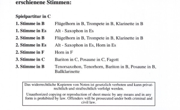 (ca. 150 Titel, mit: Abendchor: Schon die Abendglocken klangen - Abendglöckchen - Abendlied - Vulpius: Ach bleib mit deiner Gnade - Ade zur guten Nacht - Silcher: Ännchen von Tharau - Alle Jahre wieder - Liliuokalani: Alo Ahe - Als wir jüngst in Regensburg waren - Alter Jägermarsch - Strauß: Annen-Polka op.117 - Auf, auf zum fröhlichen Jagen - Auf der schwäbische Eisenbahne - Auld Lang Syne - Radecke: Aus der Jugendzeit - Mozart: Bald prangt den Morgen zu verkünden - Beim Kronenwirt - Bier her! - Bierwalzer - Birkenstoana Glöckerl - Boarischer - Boxhamerisch - Wagner: Brautchor aus "Lohengrin" - Mozart: Bundeslied - Der alte Berner Marsch - Schumann: Der fröhliche Landmann - Der Häuslratz - Der Herr ist meine Zuversicht - Friedrich II: Der Hohenfriedberger Marsch - Der Jäger aus Kurpfalz - Der Jäger in dem grünen Wald - Lyra: Der Mai ist gekommen - Schulz: Der Mond ist aufgegangen - Der Petersburger Marsch - Abt: Die Abendglocken rufen - Schäffer: Die Post im Walde - Dixie Time - Down By The Riverside - 3 Zwiefache - Du, du liegst mir am Herzen - Eine Seefahrt die ist lustig - Ein Prosit - Eisenkeilnest - Es ist ein Ros entsprungen - Es wird scho gleich dumpa - Ferstl: Fanfare - Groos: Freiheit - Freut euch des Lebens - Gaudeamus igitur - Gluck: Gebet - Geh'n wir mal rüber - Gloria in excelsis - Good Night, Ladies - Go, Tell It On The Mountain - Mendelssohn: Gottes Rat und Scheiden - Beneken: Grablied "Wie sie so sanft ruh'n" - Hallstäster Hochzeitsmarsch - Hamburger Veermaster - Hamburg ist ein schönes Städtchen - Hannover Garde du Corps Marsch - Hill: Happy Birthday - Heidschi Bumbeidschi - Heilig - Schubert: Heilig, heilig - Heut' geht es an Bord - Hinaus in die Ferne - Hoch soll er leben - Honakischer - Horch was kommt von draußen rein - Bortniansky: Hymne - Bortniansky: Ich bete an die Macht der Liebe - Ich bin ein freier Wildbretschütz - Ich din der Doktor Eisenbart - Ich hatt' einen Kameraden - Ihr Kinderlein kommet - Im schönsten Wiesengrunde - Integer vitae - Jetzt kommen die lustigen Tage - John Brown's Body - Joshua Fit The Battle Of Jericho - Keinen Tropfen im Becher mehr - Kling, Glöckchen, kling! - Kommet, ihr Hirten - Kreuzfahrer Hymne - Kuckuckspolka - Landler! - Yradier: La Paloma - Lasst uns froh und munter sein - Little Brown Jug - Lobe den Herren - Rolle: Lobgesang - Mädle ruck, ruck, ruck an meine grüne Seite - Mariechen saß weinend im Garten - Marsch - Mei Hut der hat drei Ecken - Michael, Row The Boat Ashore - Gade: Morgengesang - Kreutzer: Morgenlied - Morgen muß ich fort von hier - Muß i denn zum Städtele hinaus - Mendelssohn: Neujahrslied - Nobody Knows - Byrd: Non nobis, Domine - Nun ade, du mein lieb Heimatland - O alte Burschenherrlichkeit - Odenwald-Walzer - O du fröhliche - O du lieber Augustin - Oh Susanna - Old McDonald Had A Farm - Old Zipp Coon - Abt: O Schwarzwald, o Heimat - O Tannenbaum - Polly-Wolly-Doodle -. Rheinländer - Rheinländer aus Vorarlberg - Sabinchen war ein Frauenzimmer - Sandmännchen - Kreutzer: Schäfer's Sonntagslied - Schnacklwalzer - Koschat: Schneewalzer - Schön ist die Jugend - Kreutzer: Schon die Abendglocken klangen - Schottisch - Spohr: Selig sind die Toten - So nimm denn ,meine Hände - Sterzinger Andachtsjodler - Stille Nacht - Still, still, still - Strohschneider - Studio auf einer Reis - Tanzwalzer - The Camptown Races - Joplin: The Entertainer - The Girl I Left Behind - Sousa: The Stars And Stripes - The Yankee Doodle - Tiroler Polka - Tiroler Plattler - Händel: Tochter Zion - Beethoven: Trauergesang - Trauntaler - Lützel: Trauungshymne - Tusch - Tuschpolka - Kuhlau: Über allen Gipfeln ist Ruh' - Über den Sternen - Mozart: Üb immer Treu und Redlichkeit - Und da woll'n wir noch einmal - Vier Zünftige! - Vom Himmel hoch, da komm ich her - Waldeslust - Klauer: Wanderlied - Weißbacher - Wem Gott will rechte Gunst erweisen - When The Saints - Schrammel: Wien bleibt Wien - Beneken: Wie sie so sanft ruh'n - Wintergrün - Wohlauf noch getrunken, teilweise potpourri-artig, mit Ringmechanik, Stimme im Marschbuchformat)