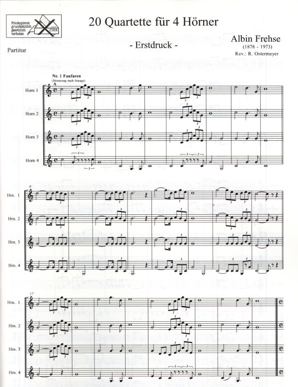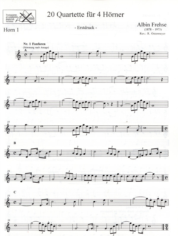 Die Vorlage für diese Ausgabe von 20 Quartetten für 4 Hörner ist im Besitz des Herausgebers. Es sind Autographe von Frehse in einzelnen Stimmbüchern. Der Komponist fast in dieser Sammlung eigene Originalkompositionen und Bearbeitungen zusammen. Die Eintragungen in den einzelnen Stimmen der Handschrift zeigen, dass daraus häufig musiziert worden sein muss. Fanfaren