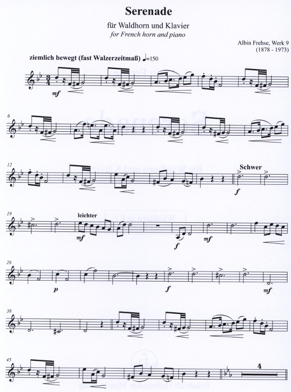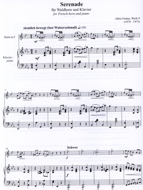 Albin Frehse komponierte vier Hornkonzerte, zahlreiche Etüden für Horn, sowie zahlreiche Kammermusik für Horn. Die mittelschwere, tonale Serenade eignet sich hervorragend zu Unterrichtszwecken. Sie soll dazu beitragen, Musiker mit neuer Musik für Horn vertraut zu machen.