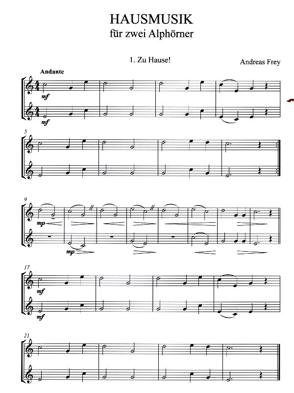 20 interessante Titel für 2 Alphörner, die gut spielbar sind. höchster Ton ist F"