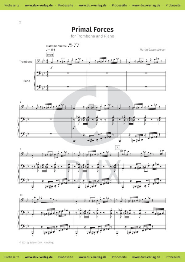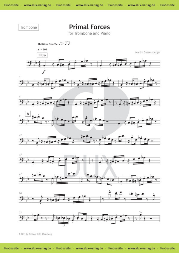 Primal Forces (übersetzt Urkräfte) ist eine Komposition für Posaune und Klavier von Martin Gasselsberger. Ein sehr kraft- und effektvolles Werk im Schwierigkeitsgrad medium-advanced, angesiedelt im weiten Feld zwischen Blues & Funk. Es ist ein beliebtes Wettbewerbsstück (z. B. prima la musica in Österreich) und eignet sich ebenfalls optimal für den zeitgenössischen Beitrag einer Übertritts- oder Abschlussprüfung an Musikschulen. Inklusive AudioStream von Vollversion und Play-along-Version. Die Ausgabe enthält einen 3-seitigen Einleger für Posaune solo.
