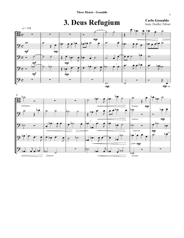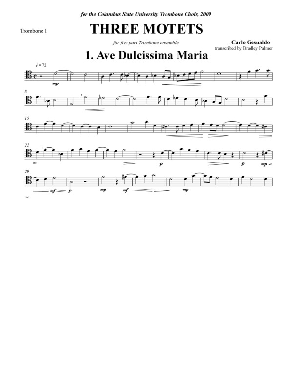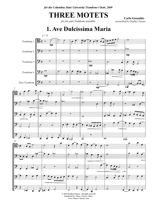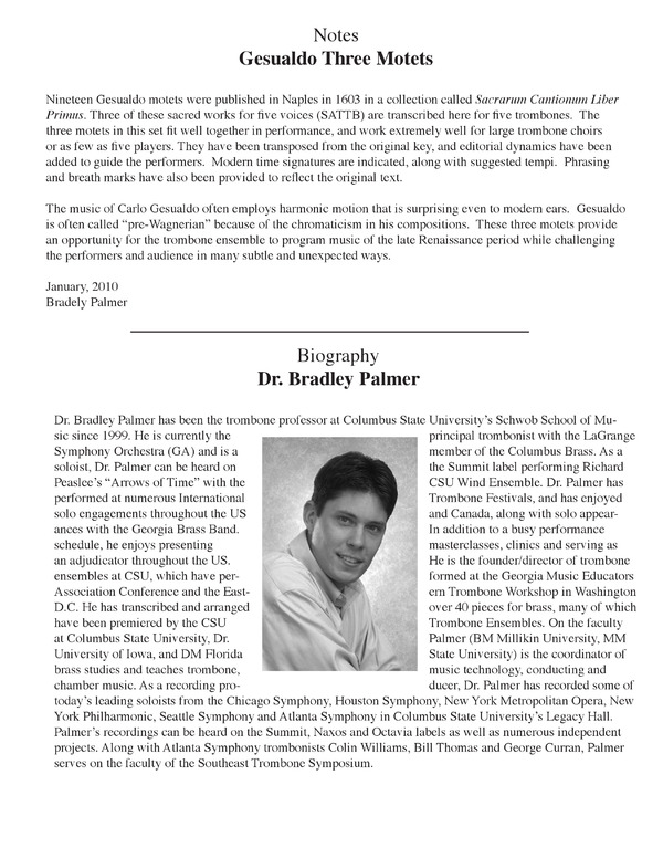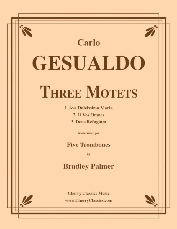 The Three Motets for Five Trombones come from a series of sacred works from 1603 titled, Sacrarum Cantionum Liber Primus. The setting works beautifully for Trombone Choir. Dr. Bradley Palmer has done a beautiful job of transcribing and editing these works.