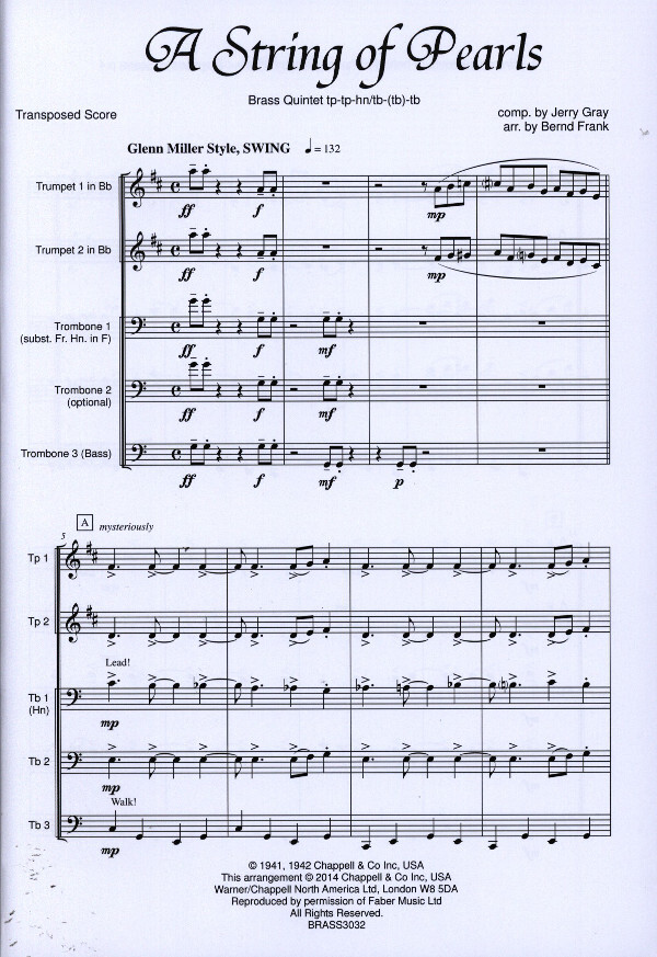 Inhalt: Partitur Stimme für Trompete 1 in B Stimme für Trompete 2 in B Stimme für Posaune 1 (Stimme für Posaune 2) Stimme für Posaune 3