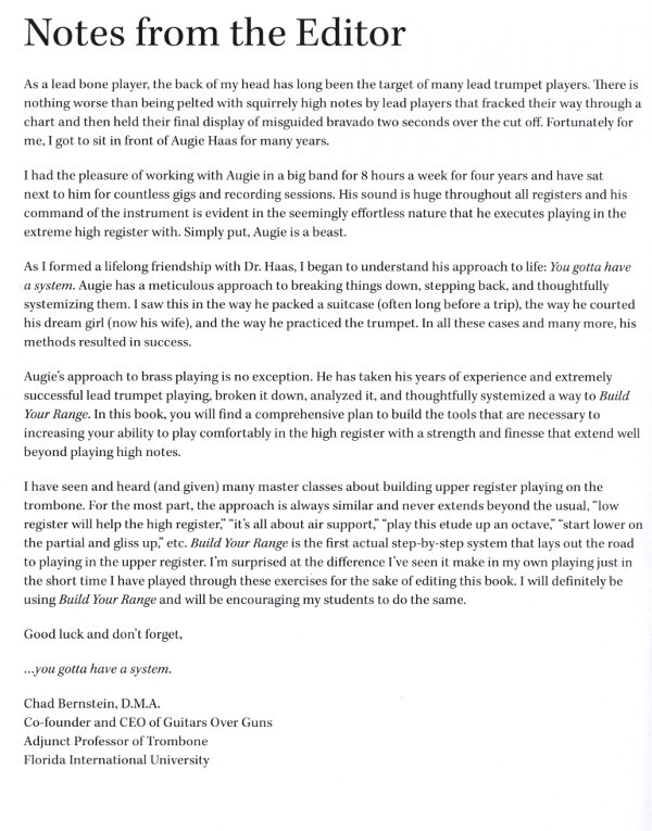 Build Your Range is a practical approach to building range and endurance to suit the current demands of all trumpet players. These ten studies are designed to help build range and endurance, as well develop time and pitch with the accompanying play-along (included with purchase). This book will help you gain a strong upper-register and ability to hit high notes, one of the most sought out tasks by trumpet players. As an added bonus, Augie Haas warm-up is also included.
