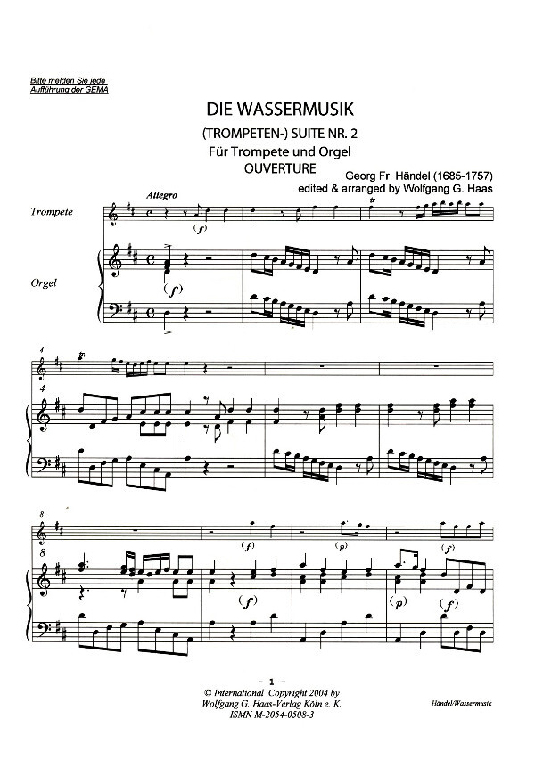 Wassermusik Nr.2 "Trompeten Suite" D-Dur Partitur, Stimmen, Ausg. für Trompete in D (C, A), Orgel (Piano)