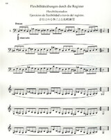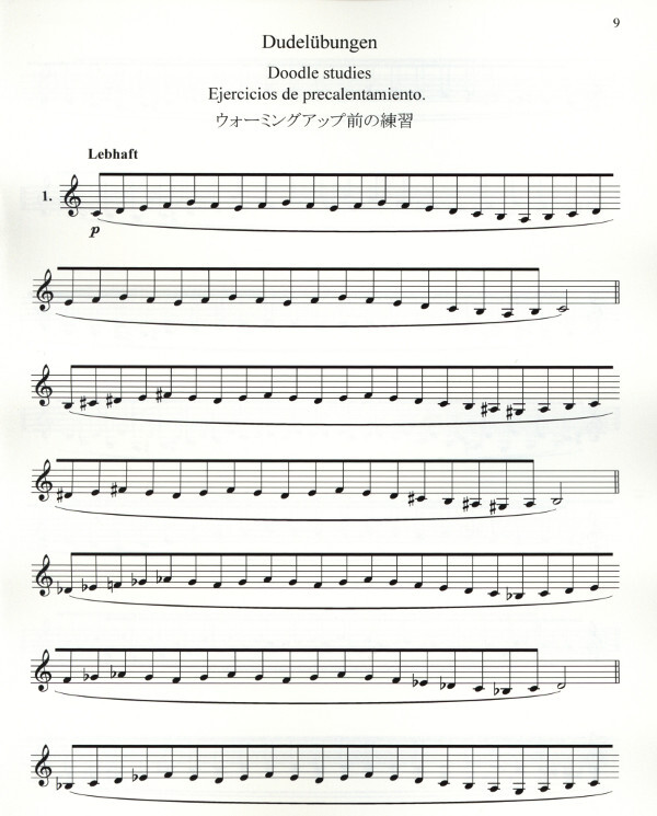 Dudelübungen, Einblasübungen, Stoß- und Bindungsübungen, Flexibilitätsübungen durch die Register, Intervallübungen, Tonleiter- und Arpeggioübungen.