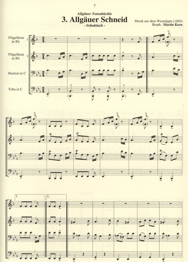 "Liebe Blasmusikfreunde ! Nach der Veröffentlichung der Allgäuer Bauernmusik und der Ober- und Westallgäuer Tanzbodenmusik freue ich mich ganz besonders über das Allgäuer Notenbüchle. Die 4-stimmigen Blechbläserstücke sind im Aufbau und im Stil ein Querschnitt meines musikalischen Schaffens der letzten Jahre. An erster Stelle stehen dabei die Bearbeitungen originaler Bläsermelodien aus Allgäuer Musikantenhandschriften des 19. Jahrhunderts. Diese sind vor allem durch die Trio-Form (oftmals mit einem 2. Teil im Trio) und die Melodie-Reihungen sehr interessant.Meine Eigenkompositionen orientieren sich im Aufbau an der gängigen Musizierpraxis der Volksmusik im Alpenraum. Besonders charakteristische Stilelemente sind dabei für mich der Wechsel zwischen DUR und MOLL und die Bordunmusik des Mittelalters mit der dafür typischen Dudelsackquinte.