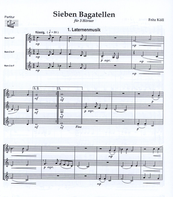 In the SIEBEN BAGATELLEN for three horns, Fritz Koells philosophy for composing is expressed especially clearly: to interpret the background with simple means. Without placing too many technical demands on the player, Köll knows exactly how to draw everything out of the middle range of the horn, thereby creating music that is sophisticated yet can be played by pupils and music lovers. The Laternenmusik at the beginning conveys a vivid image the night watchman calling on his horn. The Intrade announces the dignified arrival of esteemed guests with signals and bursts of fanfare. This, in turn, is followed by a Ballabile, which is suggestive of
