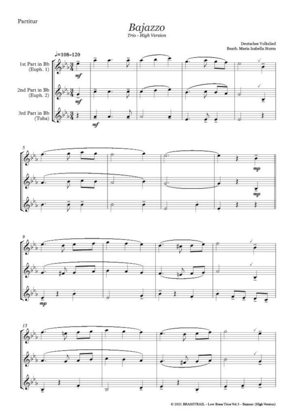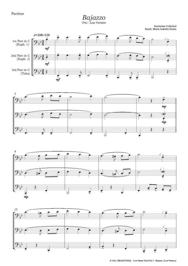 Low Brass Trios Vol.3 enthält das bekannte deutsche Volkslied Bajazzo in 2 verschiedenen Tonarten. Maria Sturm hat das gefühlvolle Volkslied als Trio für Bariton, Euphonium & Tuba arrangiert. Die Solostimme der hohen Version ist ebenfalls in unserer Bläserschule zu finden. Die Trio-Arrangements eignen sich auch für 3 Euphonien oder 3 Posaunen.