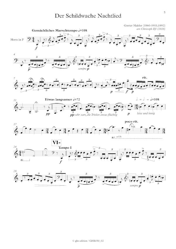 zum Klingen zu bringen, ist für mich einzigartig. Und so wuchs in mir der Wunsch, über die Fischpredigt hinaus auch alle weiteren Lieder dieses Zyklus für Horn Solo zu bearbeiten. Der vorliegende Band beinhaltet nun alle 12 heutzutage als Wunderhorn-Lieder bekannten Stücke. Ergänzt habe ich sie noch um Es sungen drei Engel einen süßen Gesang sowie Urlicht, welche, ursprünglich ebenfalls Teil des Zyklus, später in seiner zweiten und dritten Symphonie Verwendung gefunden haben.