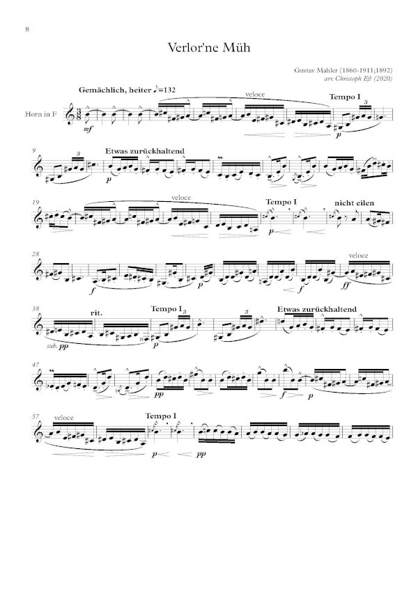Sie sollen also im besten Fall beides sein: Etüden für das Horn und Studien über Mahlers Werk. Daher gibt es immer wieder kleine Kürzungen oder eingefügte ad.lib.-Stellen sowie mögliche Sprünge so soll sich jede*r Spielende eingeladen fühlen, eine eigene Version zu entwickeln. Obwohl einige Lieder in der Praxis häufig tiefer erklingen, habe ich mich entschieden, die Tonarten wie im Orginal zu behalten. Eine Ausnahme bildet das Urlicht, weil es für unser Instrument in Des-Dur so wunderschön klingt.