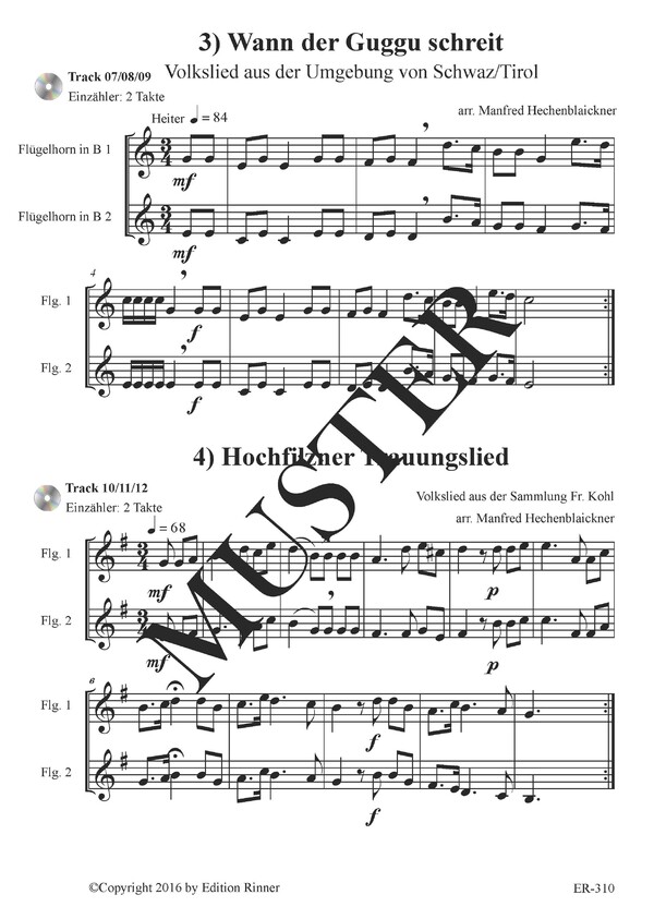 Diese Stücke wurden auf CD eingespielt. Zuerst ist die 2-stimmige Fassung zu hören, die beiden folgenden Tracks mit 1. und 2. Stimme wurden mit Einzähler versehen und sind für das selbstständige Üben hilfreich. Alle Fermaten wurden um einen Schlag verlängert. Somit wird es dem Ausführenden ermöglicht im Eigenstudium die Zweistimmigkeit kennenzulernen.
