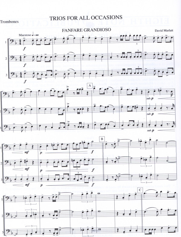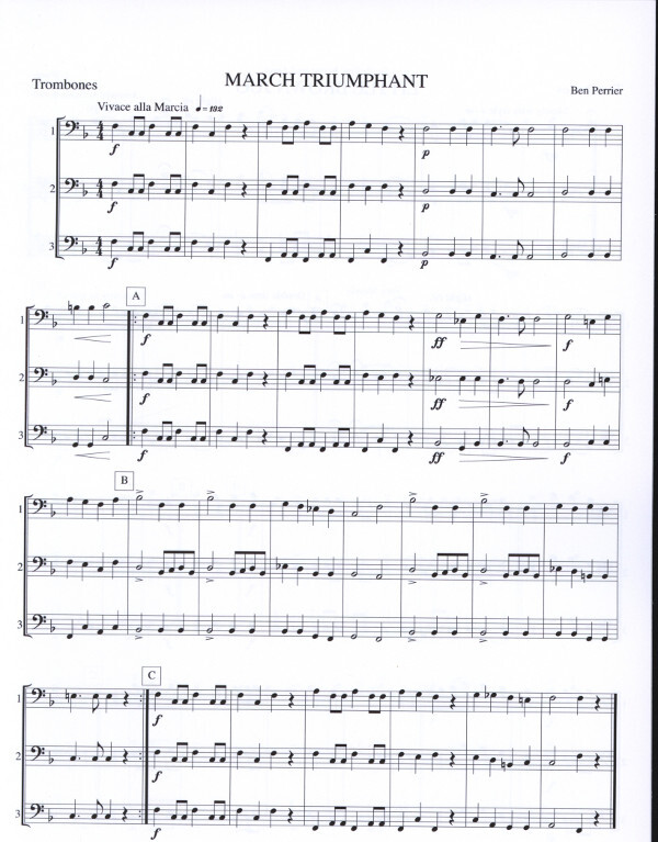 This is a collection of compositions and arrangements of well-loved music set for 3 like-instruments. The arrangements are suitable for a variety of performance situations such as school concerts, at church or on gigs in the community. Pieces included are: Fanfare Grandioso, Trumpet Voluntary, Ode to Joy, March Triumphant, Little Brown Jug, Allegro Maestoso from Water Music, Washington Post, Abide With Me, Still, Still, Still, Christ the Lord is Risen Today, Canon (Mozart), The Dwarfs March Home, The Entertainer and Brain Waves.