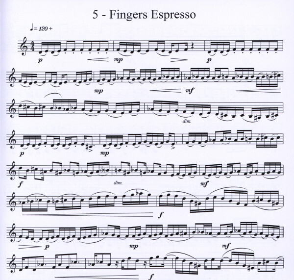 Estudo nº5 - Este estudo é baseado na escala diminuta (tom-½ tom) começando em Ré. Deverá ser tocado o mais rápido possível mas de forma a que todas as notas e articulação sejam claramente perceptíveis.