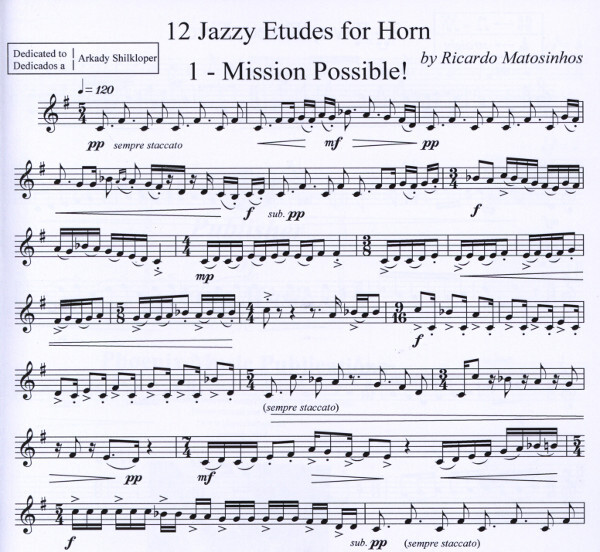 These etudes were written with the aim of filling a gap in the Horn repertoire. Usually advanced etudes for horn are too difficult in many different aspects at once. In these etudes I used different scales and modes with some extended techniques, but always in an easy and funny way; if an etude is difficult or even very difficult in one aspect, it will be easy or even very easy in others. I dedicate these etudes to the Russian horn player Arkady Shilkloper and his music, whose influence will be easily identifiable in some of these etudes.