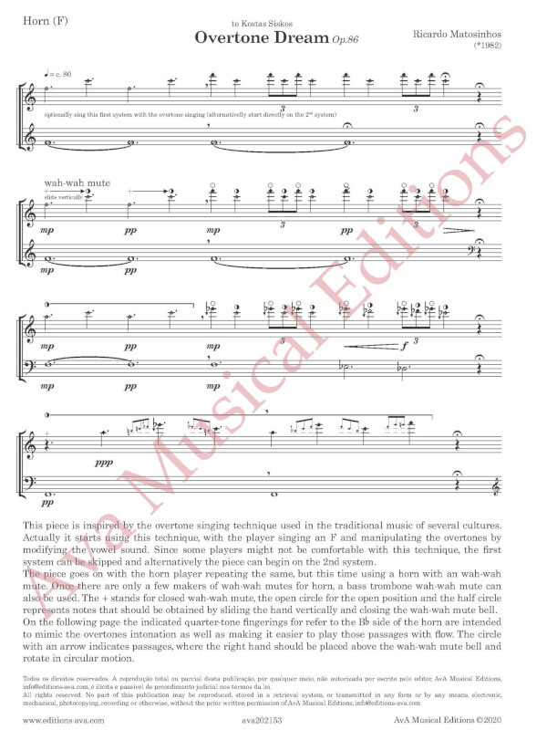 This piece is inspired by the overtone singing technique used in the traditional music of several cultures. Actually it starts using this technique, with the player singing an F and manipulating the overtones by modifying the vowel sound. Since some players might not be comfortable with this technique, the first system can be skipped and alternatively the piece can begin on the 2nd system.
