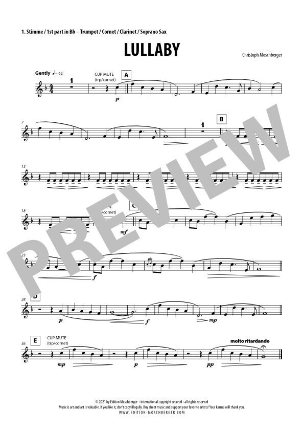 Lullaby der englische Begriff für Wiegenlied ist eine gefühlvolle Ballade von Christoph Moschberger, die mit ihrer warmen Melodik und sanften Harmonie verzaubert. Ob als ruhiger Ruhepunkt mitten im Konzert oder als berührende letzte Zugabe dieses Stück sorgt garantiert für einen Moment zum Innehalten und Träumen.
