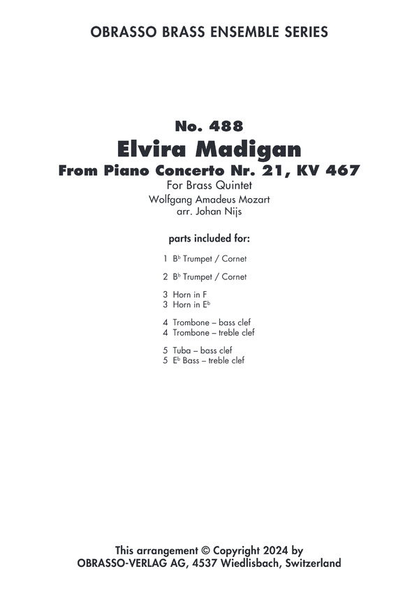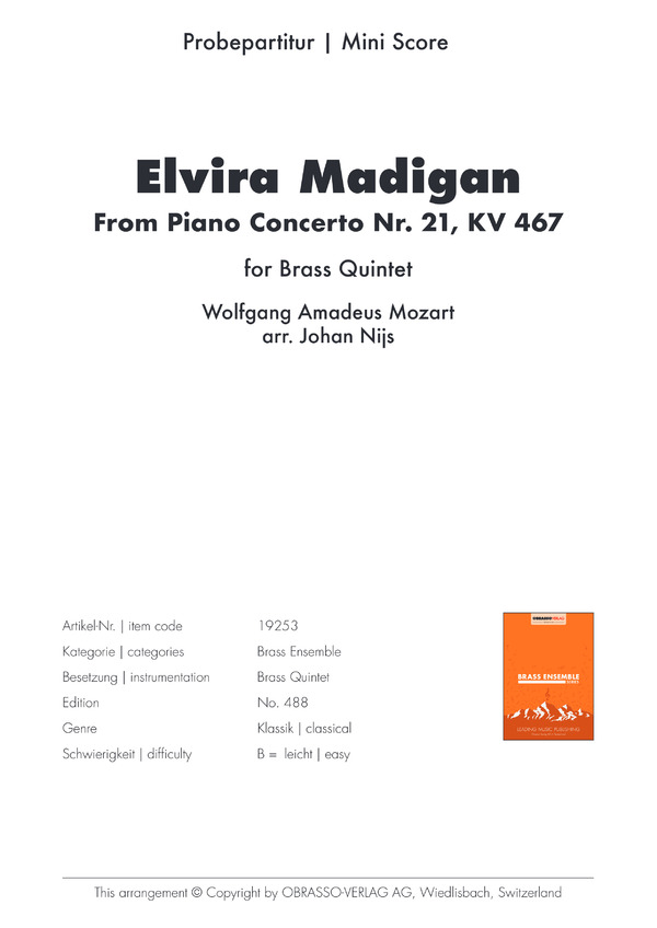 «Elvira Madigan» ist eine Komposition von Wolfgang Amadeus Mozart (arr. Johan Nijs). Im Webshop von Obrasso sind die Noten für Brass Quintett mit der Artikel-Nr. 19253 erhältlich. Das Notenmaterial ist eingestuft im Schwierigkeitsgrad B (leicht)