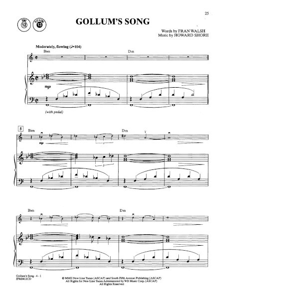 Gollum's Song (from "The Lord of the Rings: The Two Towers") In Dreams (from "The Lord of the Rings: The Fellowship of the Ring") Into the West (from "The Lord of the Rings: The Return of the King") Many Meetings