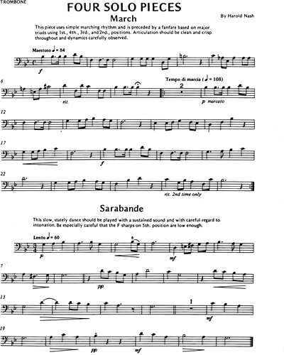Four SoloPieces is suitable for trombonists of Grade 3 standard. Each individual movement would make the perfect item for a first performance or recital. For solo Trombone with Piano accompaniment.