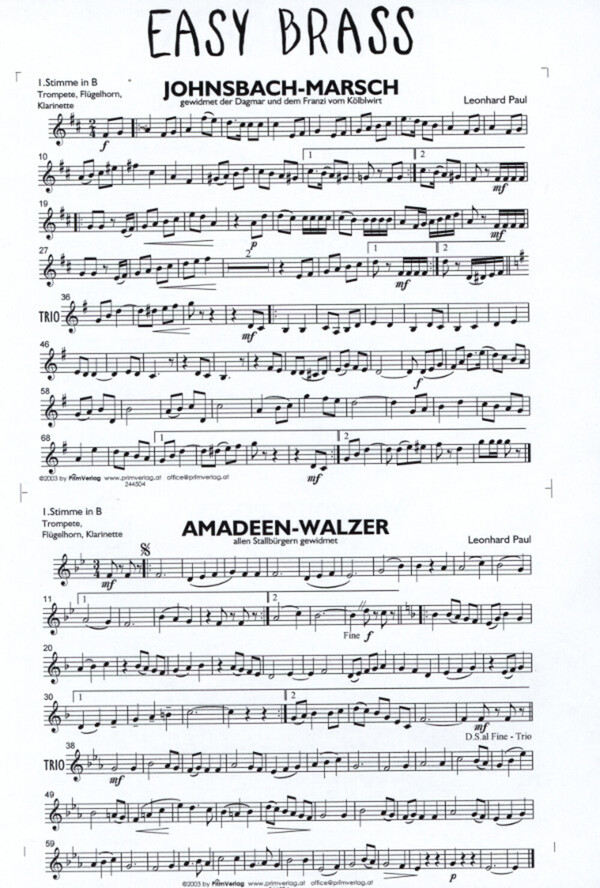 1.Stimme in B/C/ES (Trompete, Klarinette, Flöte, Alt-Sax) 2. Stimme in B/C/ES (Trompete, Klarinette, Flöte, Oboe, Alt-Sax) 3. Stimme in B/C/F (Tenorhorn, Posaune, Horn, Tenor-Sax)