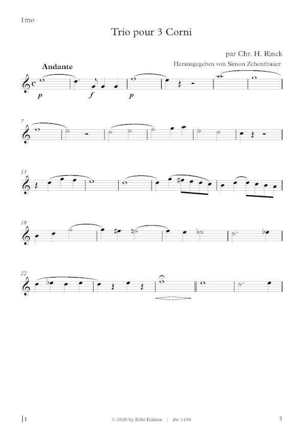 Wieder einmal ist es gelungen, ein Originalwerk der musikalischen Romantik dem Archivschlummer zu entreißen. Das "Trio pour 3 Corni" des heute kaum mehr bekannten Meisters Christian Heinrich Rinck erblickt hier zum ersten Mal das Licht der Öffentlichkeit. Die Urtextausgabe wird das an Originalwerken aus der Romantik nicht eben reich gesegnete Repertoire des Horntrios sicher bereichern.