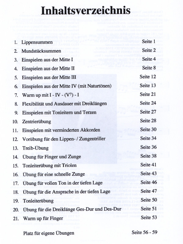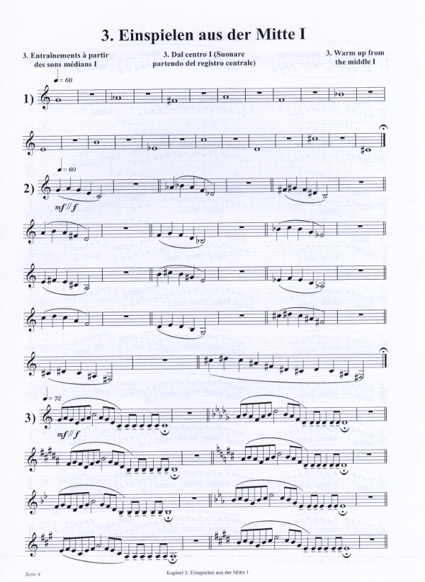 Das Hauptziel der Übungen ist es, eine flexible Spieltechnik mit rundem, grossem Ton über den ganzen Tonumfang und eine gute Ausdauer zu entwickeln, ohne dass die Tonqualität in der tiefen Lage darunter leidet. Die Übungen sind so gestaltet, dass man aus der unteren Mitte des Tonumfanges zu spielen anfängt (Konzentrierter Ansatz) und die