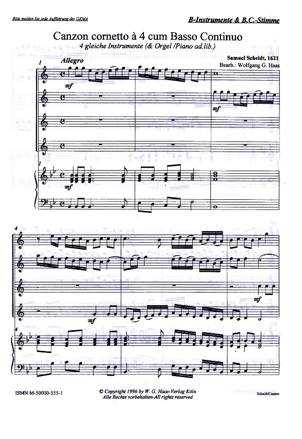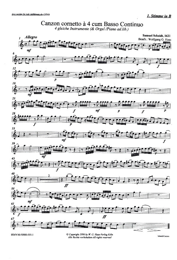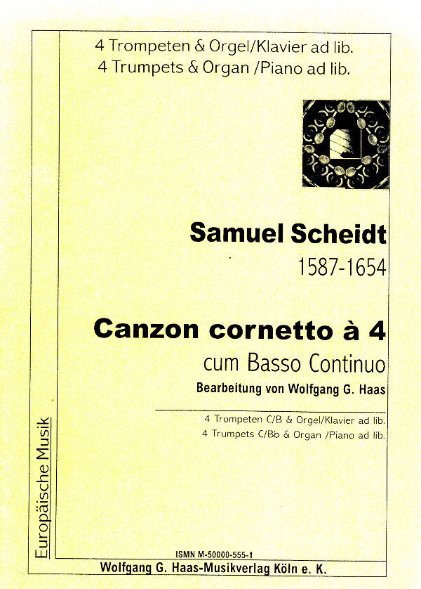 Bis dato war mir nur eine Ausgabe für 4 Trompeten des «Canzon cornetto » aus dem amerikanischen Verlag Robert King bekannt. Die Neuausgabe von Haas orientiert sich näher am Original aus Scheidts Werkzyklus «Ludi musici» für vier bis fünf Stimmen mit Generalbass aus dem Jahre 1621. Obwohl die Grundtextur bereits mit den vier Solostimmen (im Original vier Zinken, resp. cornetti) zum Tragen kommt, ist die harmonische Stütze durch das Continuo auf jeden Fall eine grosse Bereicherung der Komposition. Dieses wunderbare Opus ist ein Meisterwerk kontrapunktischer Satztechnik!