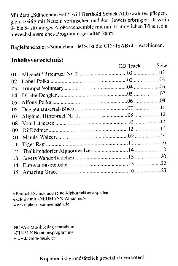 Richter: Thalkirchdorfer Alphornwalzer für 4 Alphörner Wunderer: Jägers Wanderliedchen für 4 Alphörner Charpentier: Eurovisionsmelodie für 3 Alphörner